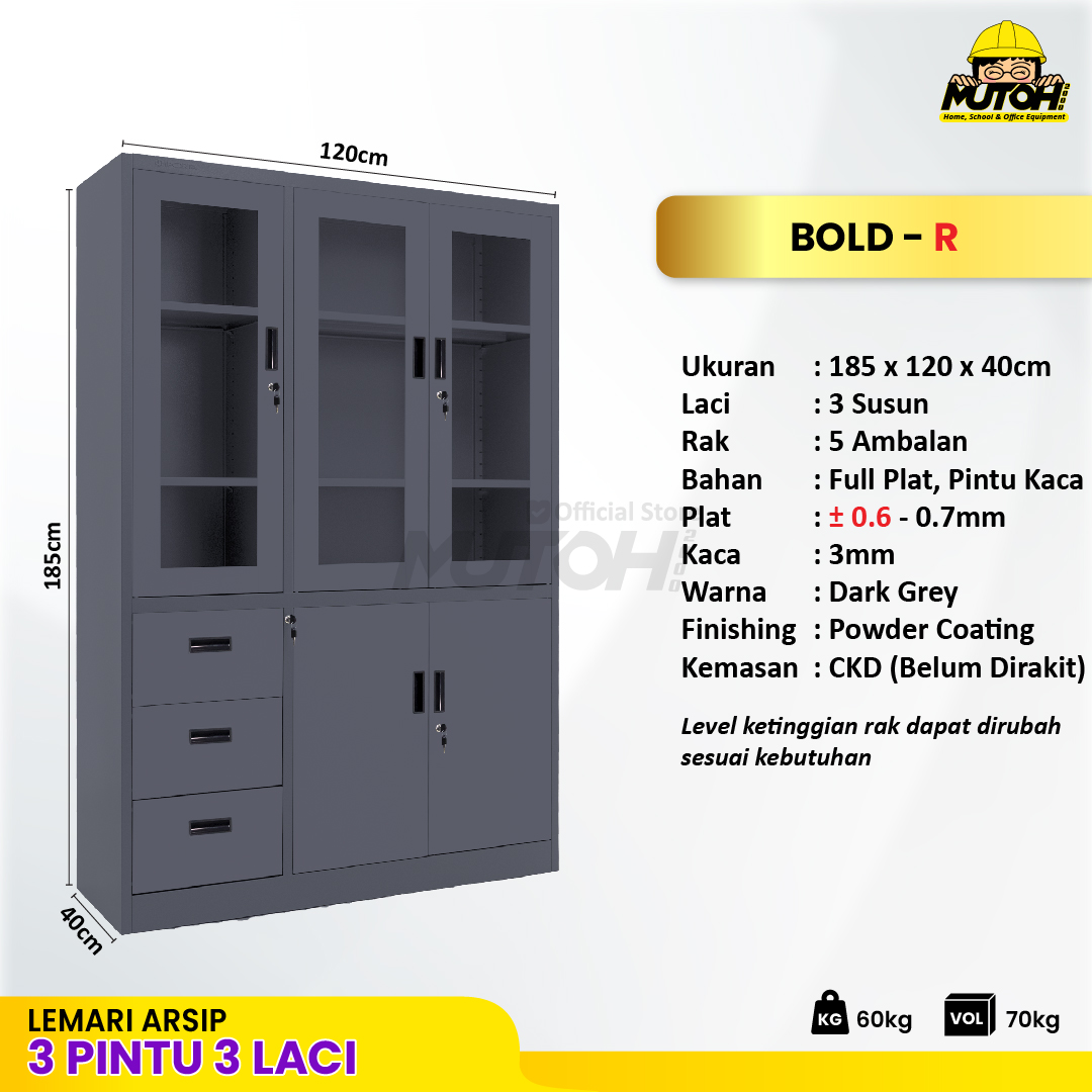 Specification: Lemari besi arsip kombinasi 3 pintu 3 laci abu tua MUTOH BOLD