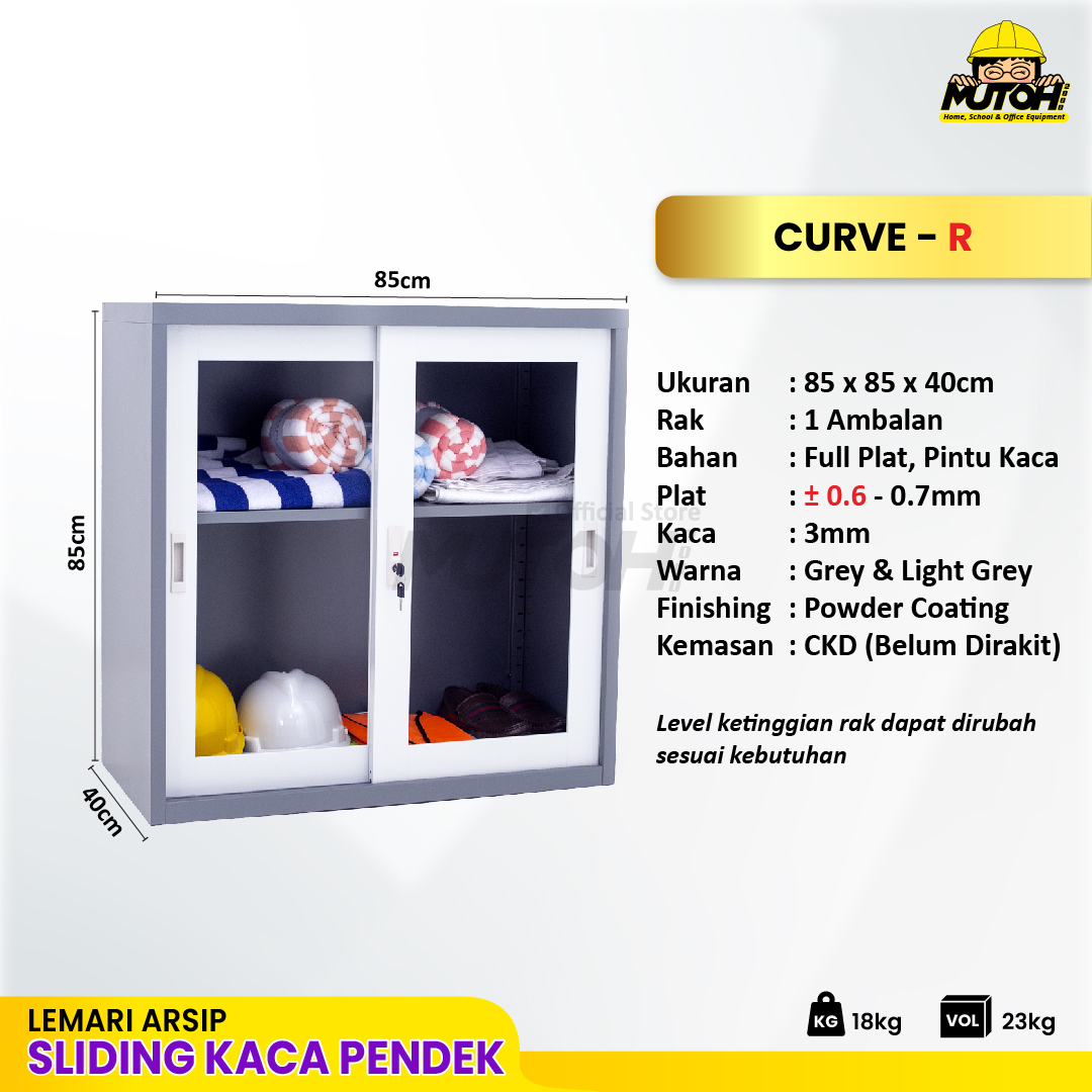 Specification: Lemari besi arsip PENDEK pintu sliding kaca 2 warna MUTOH CURVE