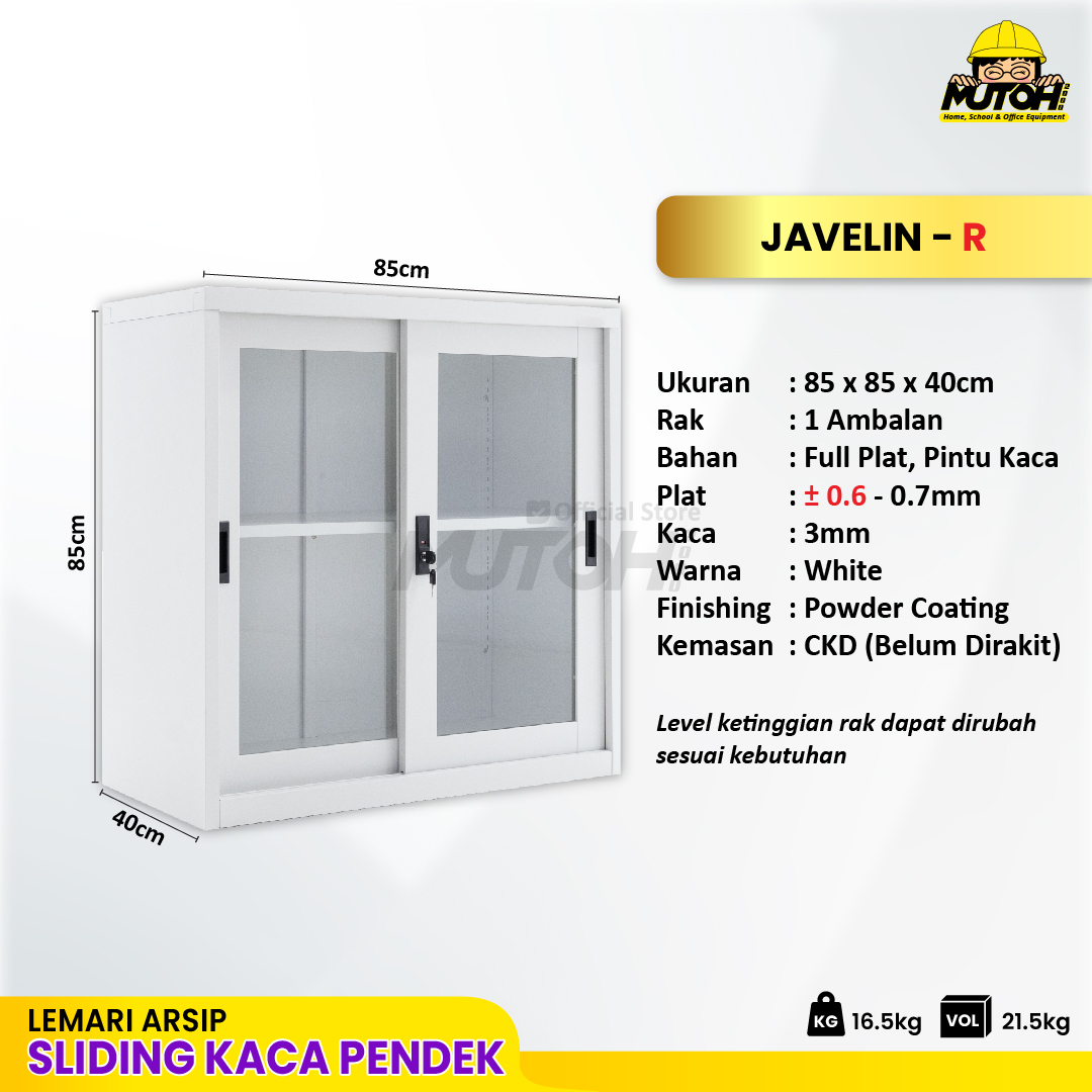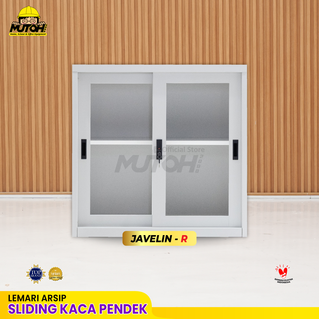 Specification: Lemari besi arsip PENDEK pintu geser sliding kaca putih MUTOH JAVELIN