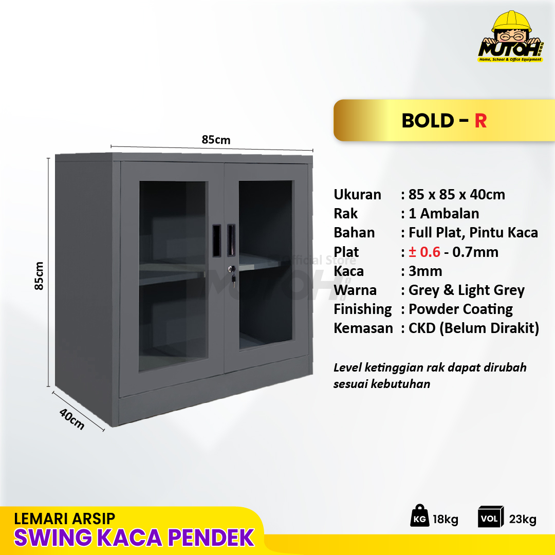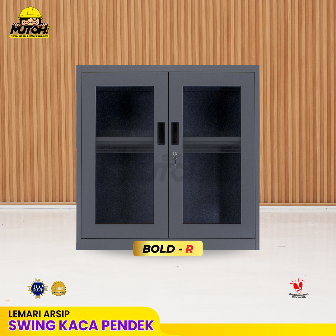 Specification: Lemari besi arsip PENDEK pintu swing kaca abu tua MUTOH BOLD