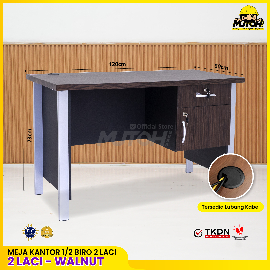 Specification: Meja kantor 1/2 Biro 120cm 2 laci kaki besi chrome | warna walnut MUTOH HQ