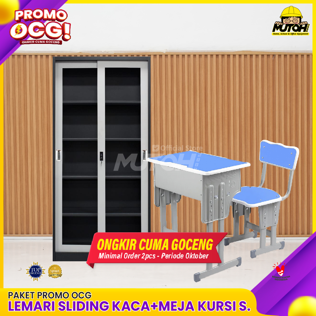 Promo OCG | Lemari Arsip Besi Sliding Kaca + Meja Kursi Sekolah Set Adjustable